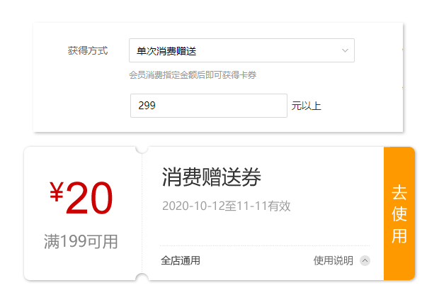 可以按单次或累计消费不同金额设置赠券,消费赠券的价值在于提升老客户的留存和持续复购,通过消费后立即给客户赠送优惠券,不仅提高复购率,还能培养客户在公众号的消费习惯,增强客户粘性。