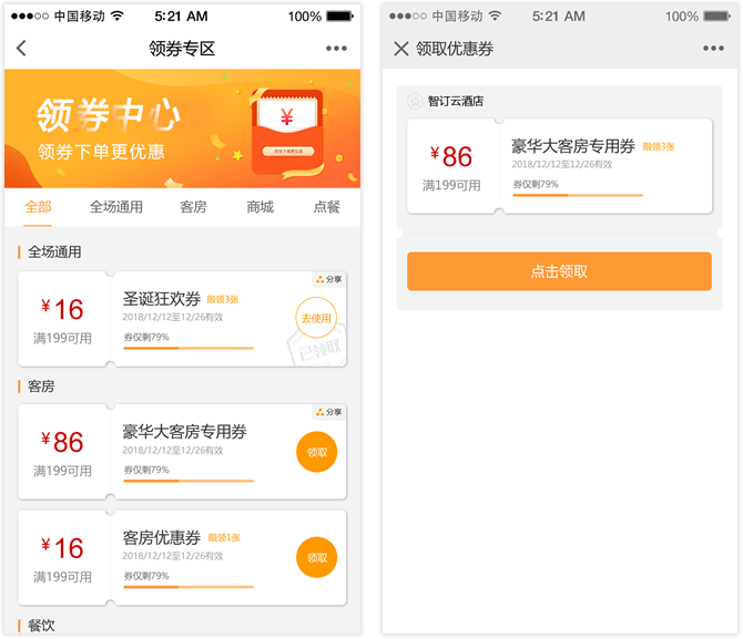 关注酒店公众号赠券具有快速发放和领用优惠券的特点,让客户在第一时间获得优惠,无需注册即可快速下单,避免因领取和注册流程繁琐而流失客户,当然酒店也可根据实际需求设置注册才能用券。