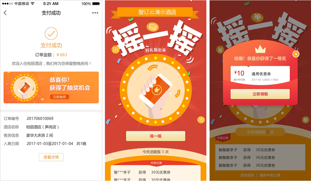 场景一:关注摇奖:客户关注酒店公众号,点击摇一摇链接进入摇奖页面,摇动手机~即可抽取大奖