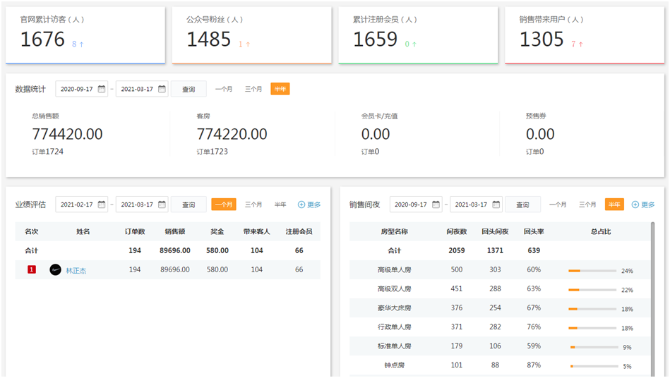 2020年安徽某铜艺主题特色酒店自营业以来不时推出“摇一摇”活动,奖品类型丰富多彩,每位到店的客户都乐此不疲的参加活动,享受其中的乐趣,因而该活动已成为酒店的一大特色,也大大提升了营业额。数据显示自官微上线半年以来,累计访问量1676人,新增粉丝1485人,累计自有会员1659人,累计销售额774420元,储蓄私域流量的同时也节省了OTA的高额佣金,直接间接带来的好处不言而喻… …