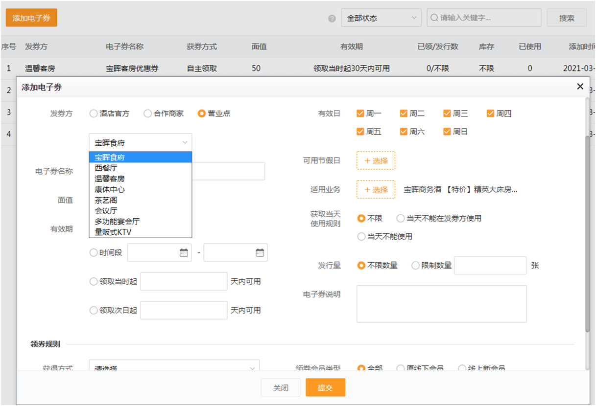 系统支持以酒店官方、营业点或合作商家为发券方进行电子券发放,添加管理该发券方可发放的电子优惠券,可设置该电子券领取和使用限制