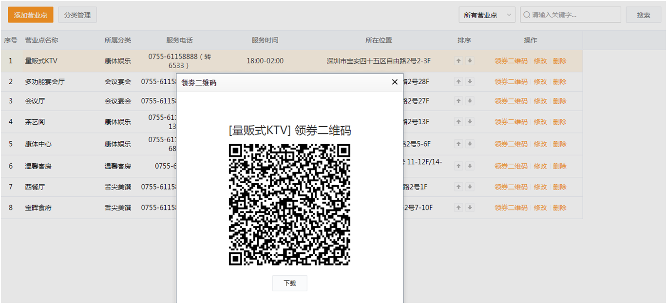 1.自主领取系统为每一个营业点或合作商家生成专属的领券二维码,客人只要通过扫码即可进入领券页面,按规则领取电子券