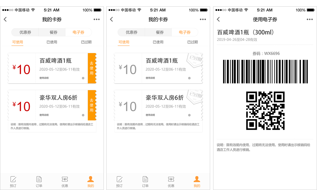 每张电子券都附有使用说明,客人到酒店前台、营业点或合作商家后直接出示电子券的条形码给工作人员进行核销使用