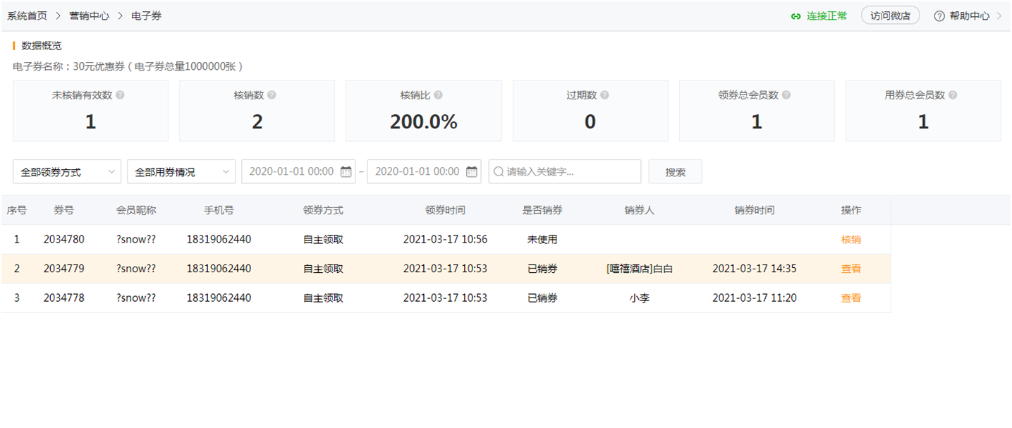 系统自动统计每一种电子券的效果数据,包括:发行数、领券数、用券数、未核销数和过期数等,效果数据一目了然。可按时间段、领券方式和用券情况搜索电子券的使用情况,也可以通过手机号或关键词搜索某一位用户的领用券情况