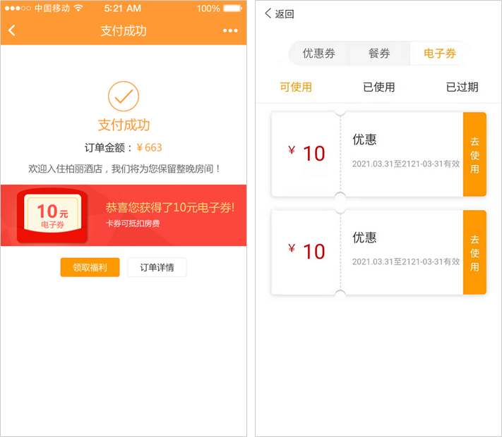综合体酒店内部推广电子券,客人消费后可获得不同面额的电子券,所得电子券酒店各营业点通用
