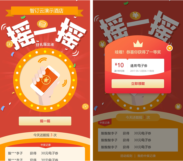 通过趣味性活动,如:摇一摇、涨粉神器等,客人以幸运抽奖或完成任务的形式获得不同面值的电子券