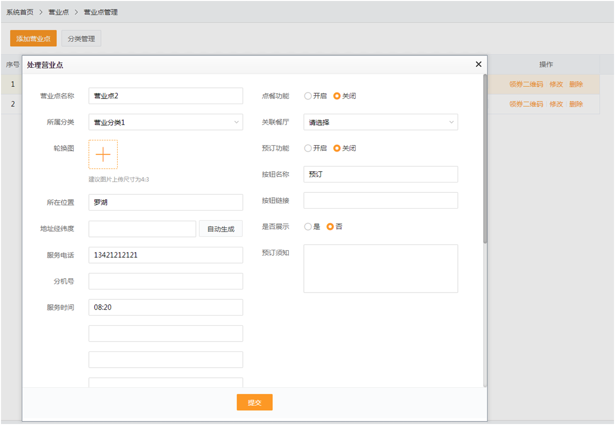 系统支持按分类添加多个营业点的介绍信息,可设置是否开启在线订单提交功能或外链其他预订页面