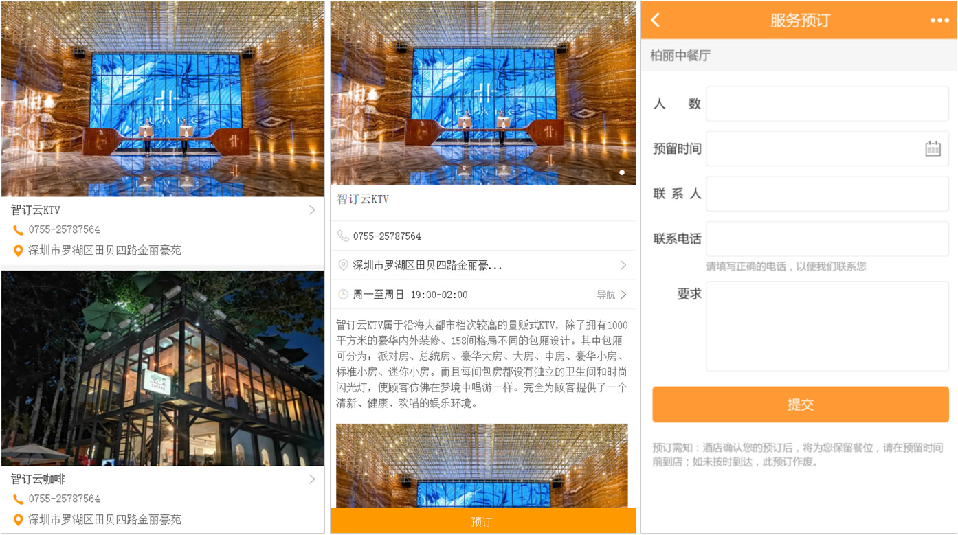 智订云“营业点”是专为综合性酒店量身定制的服务模块,能在线展示各营业点的介绍信息(如图片、简介、电话、营业时间等),客户可以在线提交营业点服务订单。让酒店的综合服务全面上线!