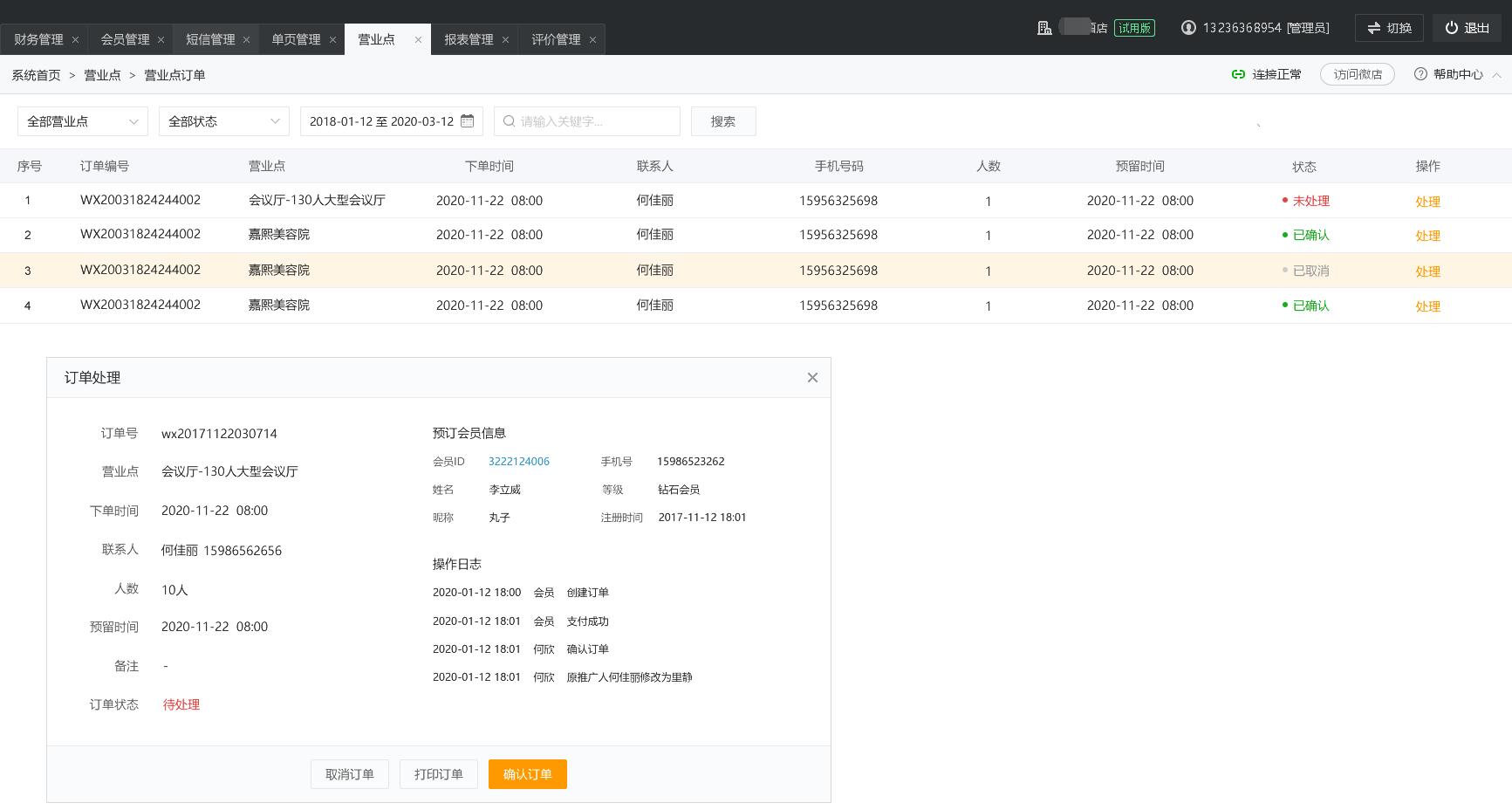 酒店授权员工可以智订云后台查看、管理各营业点的服务订单