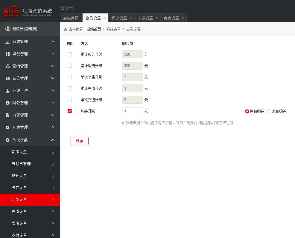 登录“智订云酒店营销系统”(zidinn.com),左菜单选择【系统设置】-【会员设置】进入页面,可以启用会员升级方式和所属达到的条件