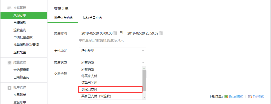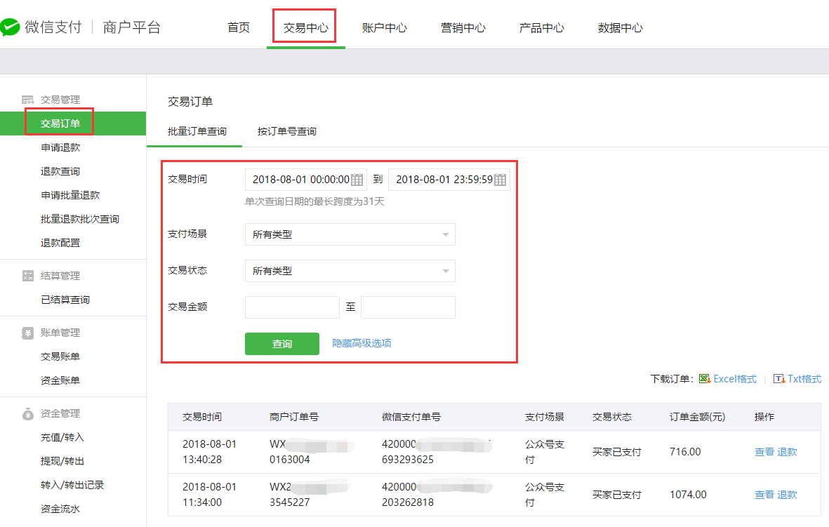 2、点击顶部菜单栏选择“交易中心”下的“交易订单”页面进入选择交易时间查询条件进行订单查询(注意:交易状态请选择“买家已支付”,否则查询/导出的总金额可能与智订云后台对应不上),点击订单后的“查看”按钮可以查看订单详情