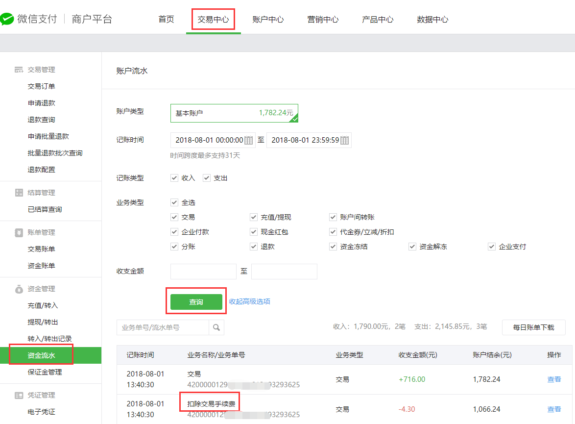 3、点击顶部菜单栏选择“交易中心”下的“资金流水”进入页面,选择日期查询条件查询每日交易订单及产生的手续费